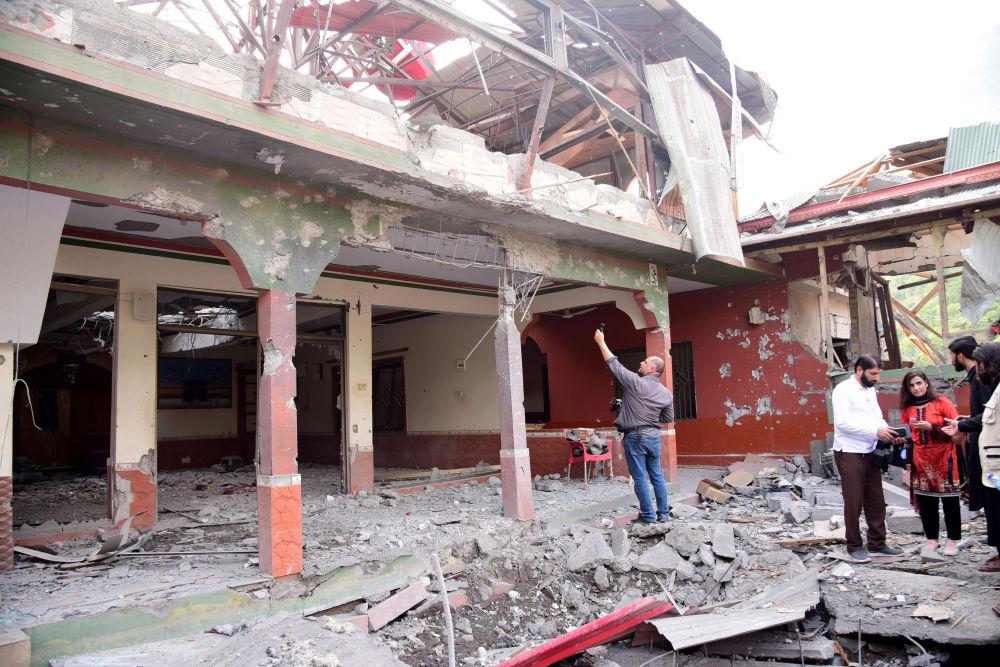 5月7日,在巴控克什米尔地区首府穆扎法拉巴德,人们在一幢遭印度空袭的建筑内查看损失情况。新华社发(穆罕默德·丁·穆加尔摄)