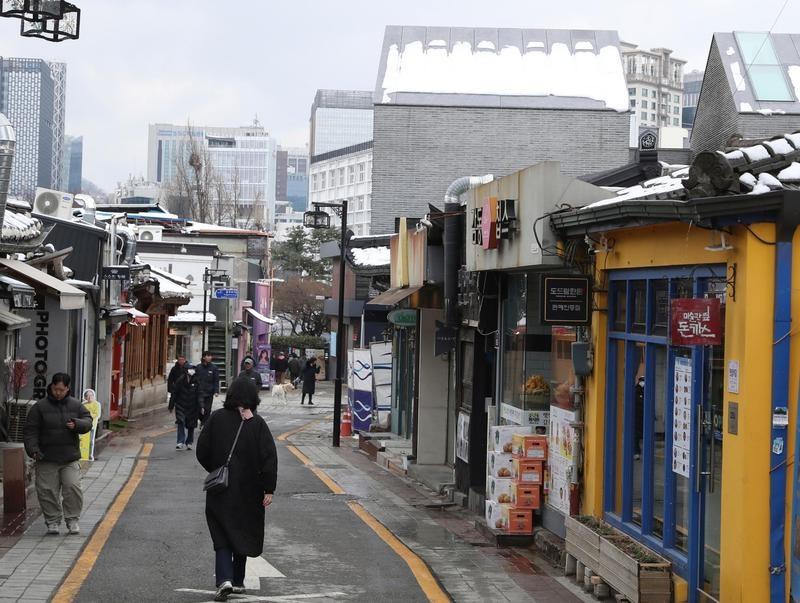 3月18日,在韩国首尔街头,三清洞一带的屋顶覆盖着积雪。新华社记者姚琪琳摄