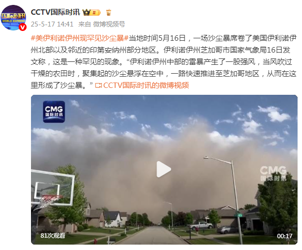 当地时间5月16日,一场沙尘暴席卷了美国伊利诺伊州北部以及邻近的印第安纳州部分地区。伊利诺伊州芝加哥市国家气象局16日发文称,这是一种罕见的现象。“伊利诺伊州中部的雷暴产生了一股强风,当风吹过干燥的农田时,聚集起的沙尘悬浮在空中,一路快速推进至芝加哥地区,从而在这里形成了沙尘暴。”