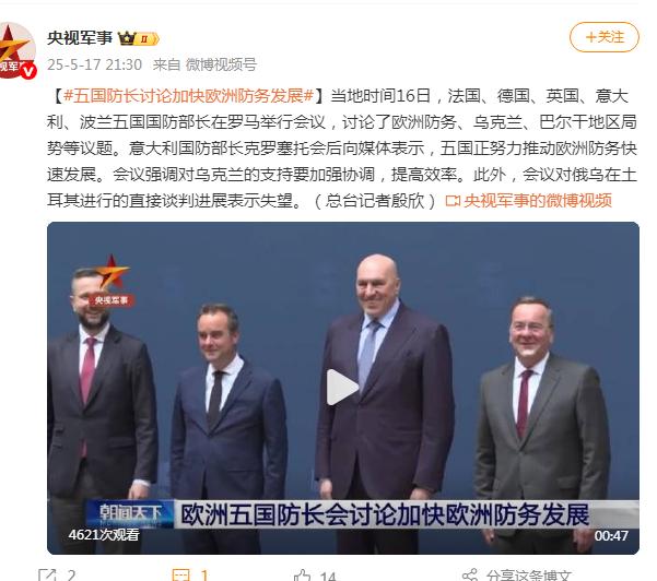 当地时间16日,法国、德国、英国、意大利、波兰五国国防部长在罗马举行会议,讨论了欧洲防务、乌克兰、巴尔干地区局势等议题。意大利国防部长克罗塞托会后向媒体表示,五国正努力推动欧洲防务快速发展。会议强调对乌克兰的支持要加强协调,提高效率。此外,会议对俄乌在土耳其进行的直接谈判进展表示失望。(总台记者殷欣)