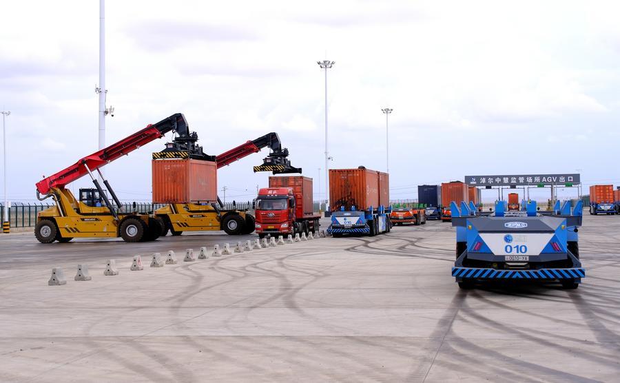 新华社呼和浩特5月21日电(记者李云平)一辆辆满载进口煤炭和铜精矿的货车排队入境,一台台运载集装箱的AGV无人驾驶车辆往来穿梭,一座座建设国门的塔吊勾勒出边境城镇的天际线。
