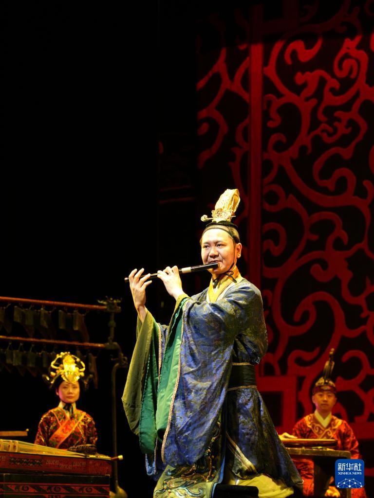 5月20日,演员在法国巴黎莫加多剧院里向观众呈现大型音乐舞蹈史诗《编钟乐舞》。新华社记者 唐霁 摄