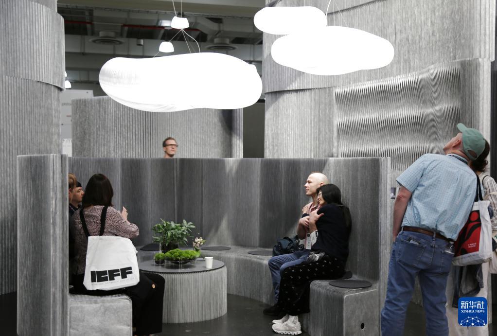 5月18日,在美国纽约举行的2025年国际当代家具展现场,人们在美国康涅狄格州家具企业赫勒公司的展区参展。新华社记者 刘亚南 摄