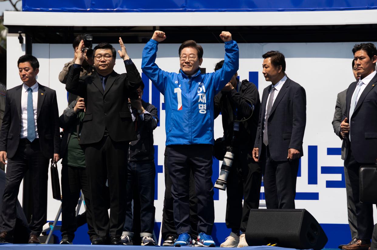 5月12日,李在明(中)在首尔参加总统选举竞选活动。新华社发(全休相摄)
