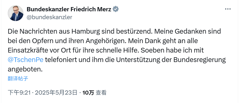 袭击发生后,德国总理默茨与汉堡市长彼得·辰切尔通了电话,并向他传达了联邦政府的支持。默茨在社交媒体平台X上写道:“汉堡传来的消息令人震惊。感谢所有现场紧急救援人员的迅速援助。”