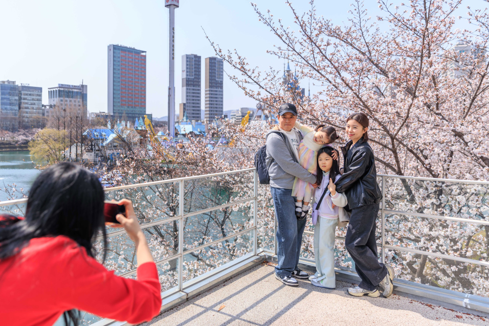 4月6日,人们在韩国首尔石村湖附近赏樱拍照。新华社发(朴晋泽摄)