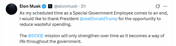 次日,马斯克在社交媒体上“官宣”离职决定并对特朗普表示感谢。
