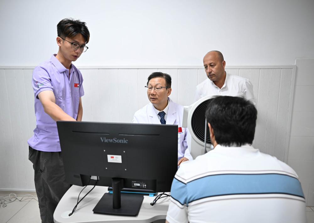 5月31日,在塔吉克斯坦杜尚别,中国眼科专家党光福(中)在防盲合作中心为当地市民做眼科检查。新华社记者 李任滋 摄
