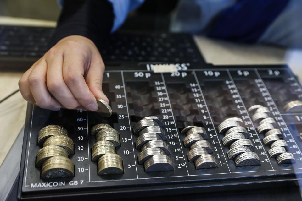 2016年10月8日,在英国伦敦,一名货币兑换工作人员在整理英镑硬币。新华社记者韩岩摄