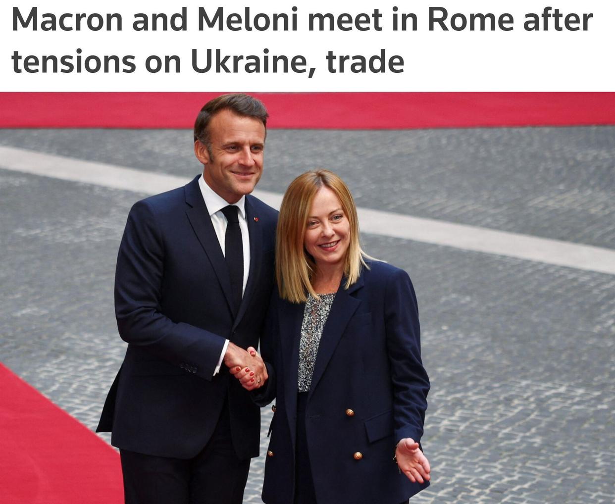 从政治立场上看,梅洛尼代表的是右翼民粹主义,马克龙属于中间派。法国右翼民粹的代表就是马克龙长期的政坛劲敌——勒庞。这导致马克龙和梅洛尼的关系一直不和谐。而梅洛尼一直认为法国现在的诸多主张对意大利不利,她也不希望在这种场合高调展示她和马克龙之间的“友谊”。
