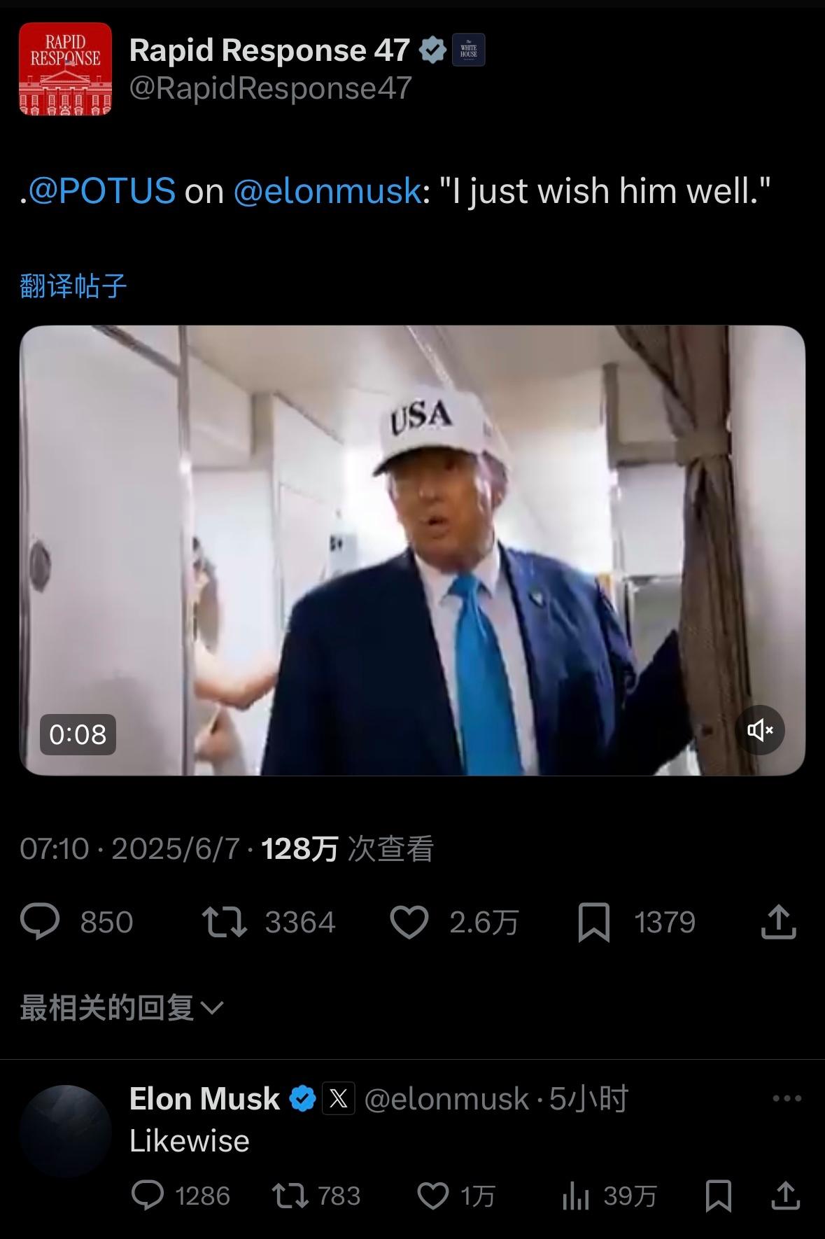 当地时间6月6日,当被问及马斯克时,特朗普在“空军一号”上对媒体称,自己太忙以至于“没有想过埃隆”“我只是希望他一切都好”。几个小时后,马斯克在社交平台X上对这一视频片段作出回复,留言称“一样(Likewise)”。