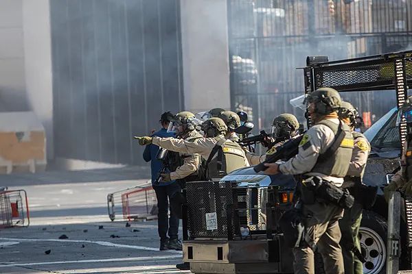 当天最激烈的冲突发生在洛杉矶市中心以南大约30公里的派拉蒙市,那里是拉美裔移民聚居区。上百名全副武装的联邦机构执法人员与当地社区数百名抗议者对峙后发生冲突,执法人员发射了催泪瓦斯和震爆弹,抗议者投掷石块和水瓶还击。