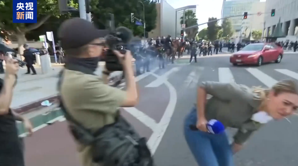 澳大利亚媒体记者 劳伦·托马西:在对峙了一个小时后,情况迅速恶化,骑警将马匹回撤,然后向抗议者发射橡皮子弹,让他们离开洛杉矶的中心地带。