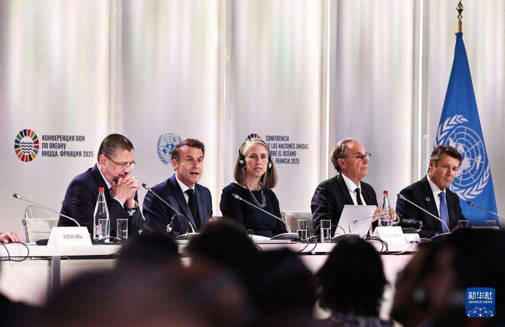 6月9日,在法国尼斯,法国总统马克龙(左二)在第三届联合国海洋大会开幕式上致辞。新华社记者 高静 摄