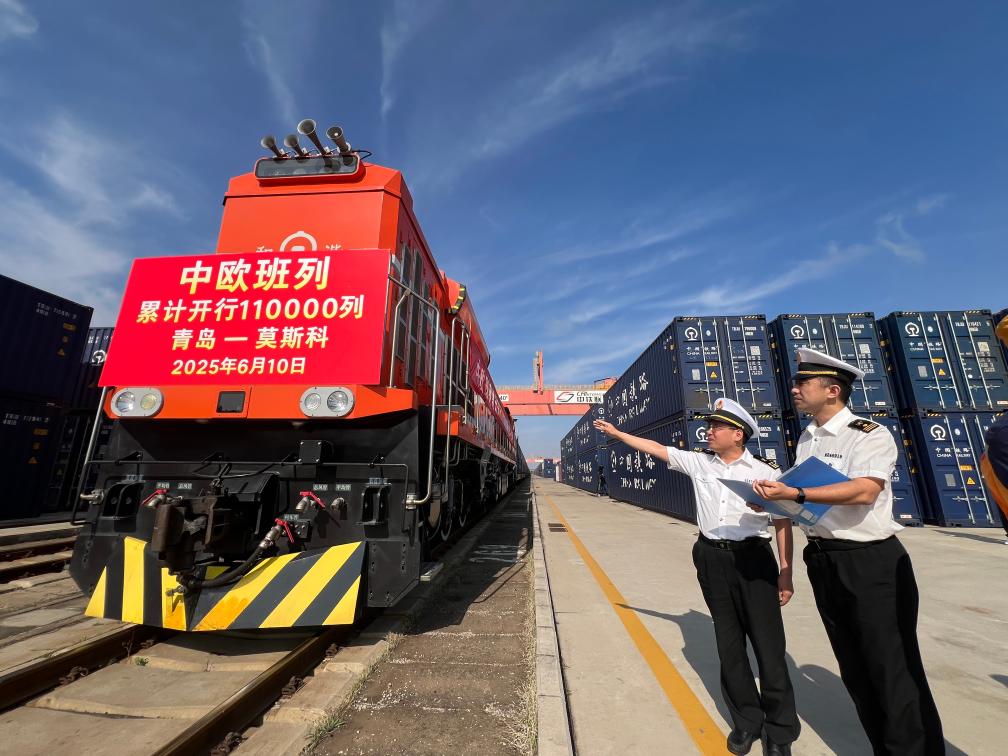 6月10日,随着75052次中欧班列从青岛胶州站缓缓驶出,中欧班列累计开行突破11万列。新华社记者 尹栋逊 摄