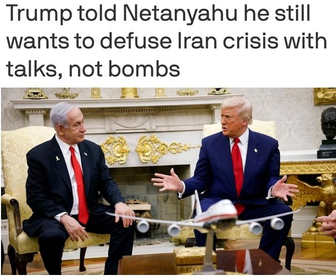 据美媒报道,美国总统特朗普告诉以色列总理内塔尼亚胡,他仍然希望通过谈判而不是炸弹来化解伊朗危机。