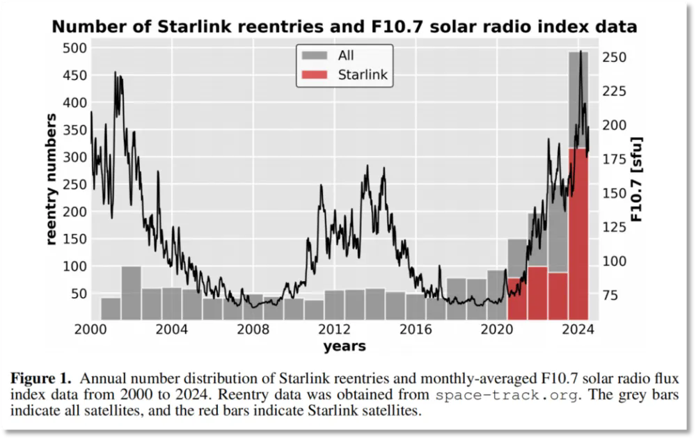 研究显示,“星链”卫星于2019年首次发射,2020年就有2颗坠落,从2020年到2024年有583颗“星链”卫星从极低地球轨道坠落,其中2021年坠落78颗、2022年99颗、2023年88颗,而2024年的坠落数量多达316颗。
