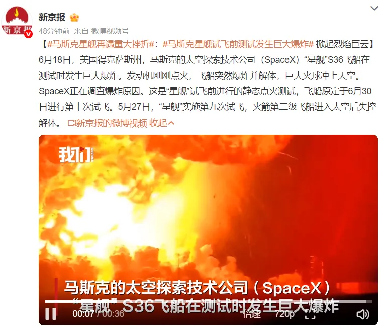 6月18日,美国得克萨斯州,马斯克的太空探索技术公司(SpaceX)“星舰”S36飞船在测试时发生巨大爆炸。发动机刚刚点火,飞船突然爆炸并解体,巨大火球冲上天空。SpaceX正在调查爆炸原因。这是“星舰”试飞前进行的静态点火测试,飞船原定于6月30日进行第十次试飞。5月27日,“星舰”实施第九次试飞,火箭第二级飞船进入太空后失控解体。