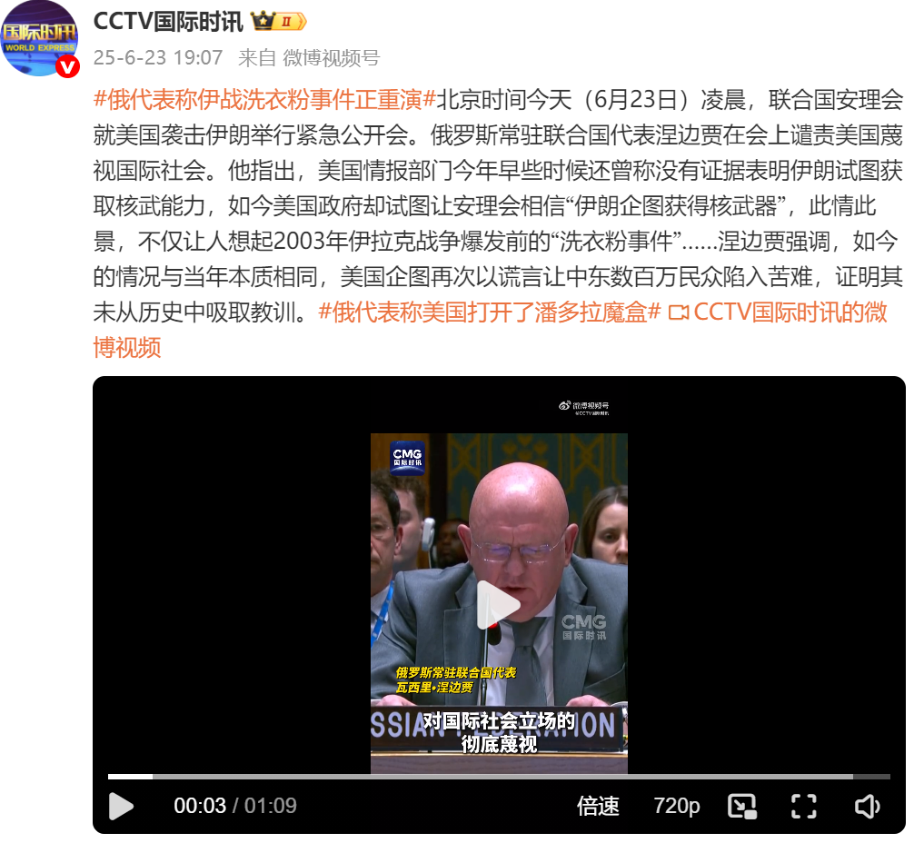 北京时间今天(6月23日)凌晨,联合国安理会就美国袭击伊朗举行紧急公开会。俄罗斯常驻联合国代表涅边贾在会上谴责美国蔑视国际社会。