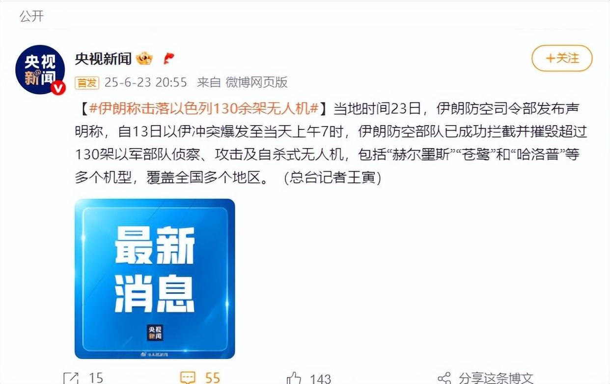 伊朗称击落以色列130余架无人机,包括“赫尔墨斯”“苍鹭”和“哈洛普”等多个机型
