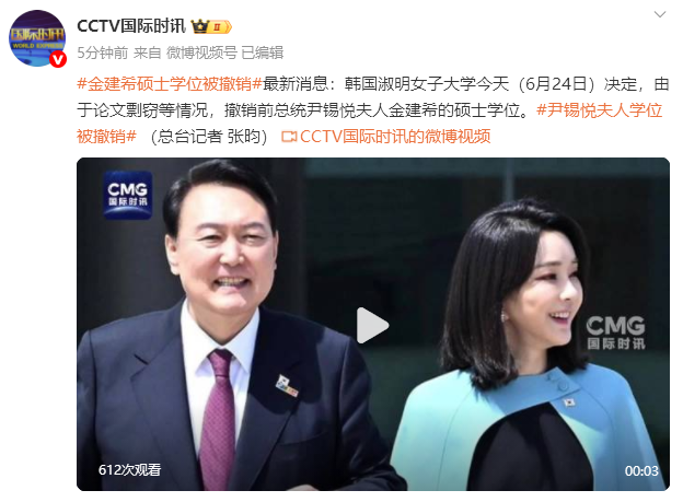 韩国淑明女子大学今天(6月24日)决定,由于论文剽窃等情况,撤销前总统尹锡悦夫人金建希的硕士学位。