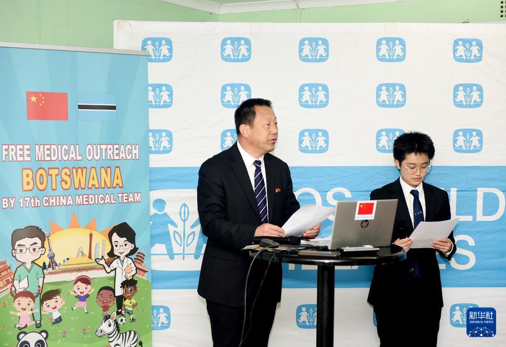 6月22日,在博茨瓦纳首都哈博罗内郊区的SOS儿童村,第17批中国援博茨瓦纳医疗队队长樊万东(左)在义诊及捐赠活动中致辞。新华社发(策基索·特巴洛摄)