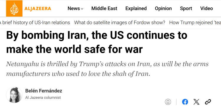 6月22日,卡塔尔半岛电视台网站发表专栏作家贝伦·费尔南德斯撰写的评论文章《通过轰炸伊朗美国不断让世界变得更适合战争》。文章直指美国政府一边高喊“呼吁采用外交手段解决问题”,一边参与甚至主导非法袭击的矛盾行径,揭批美国长期以来以和平之名行战争之实的虚伪面目。