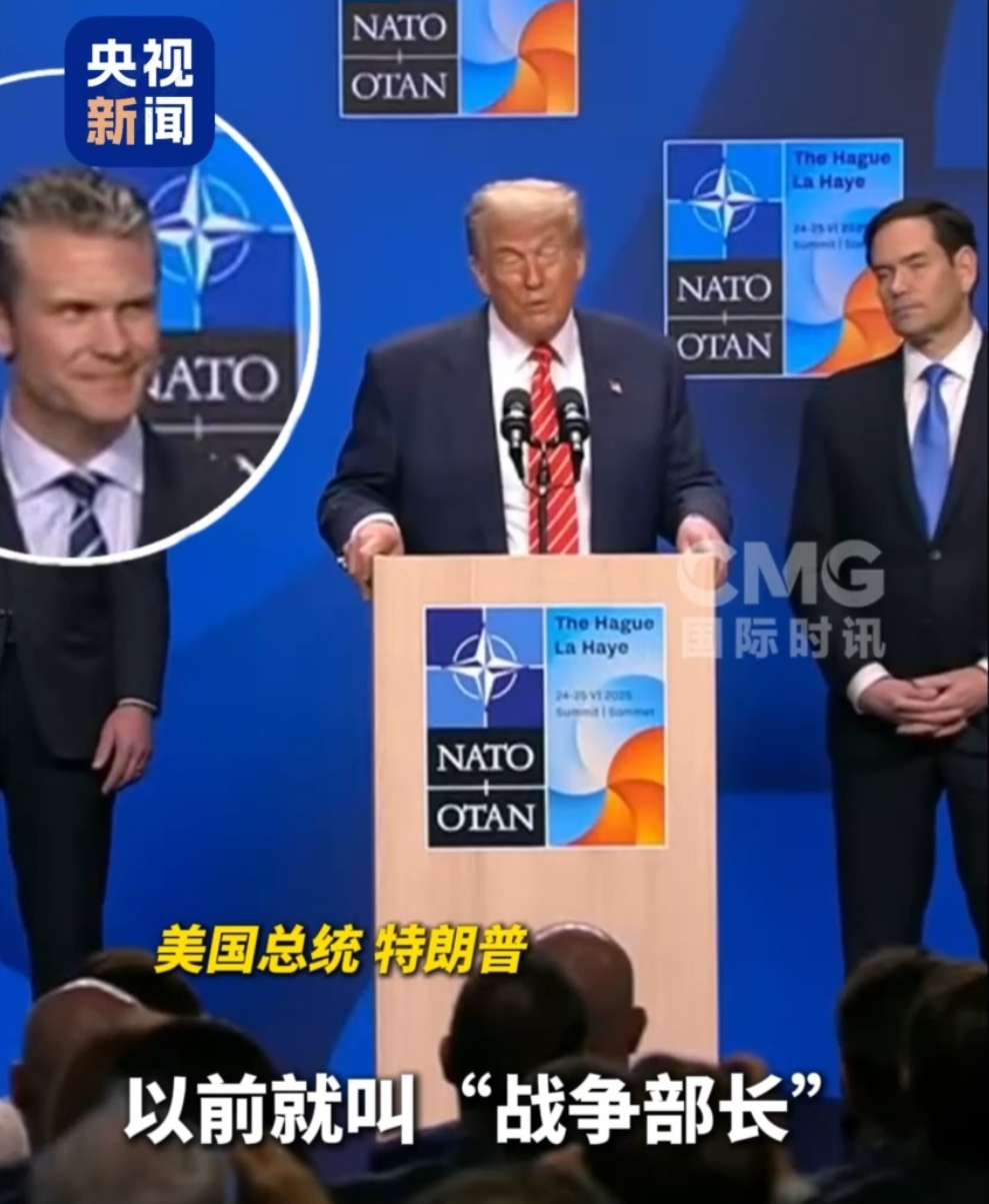 6月25日,美国总统特朗普在北约峰会后举行的发布会上称美国国防部长赫格塞思为“战争部长”,并称接下来的几周也要用这个称呼,因为“我们感觉像战士一样”。