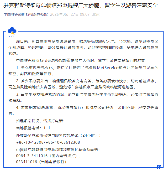 中国驻克赖斯特彻奇总领馆郑重提醒广大侨胞、留学生及在南岛旅行的游客: