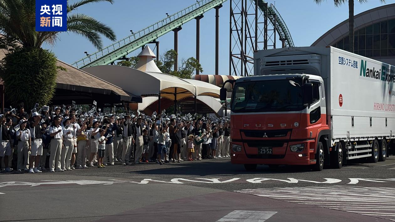 大批来自日本各地的大熊猫粉丝一早来到游乐园,为它们送行。