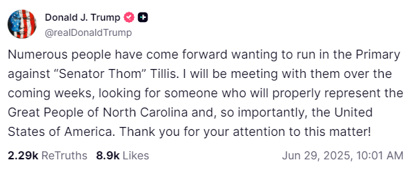 共和党籍北卡罗来纳州参议员汤姆·蒂利斯投下反对票后,特朗普在社交媒体发文威胁道,许多人都想在明年的议员竞选中与蒂利斯竞争,他将在未来几周与这些人会面,寻找一位“能够真正代表北卡罗来纳州人民以及美国”的人选。