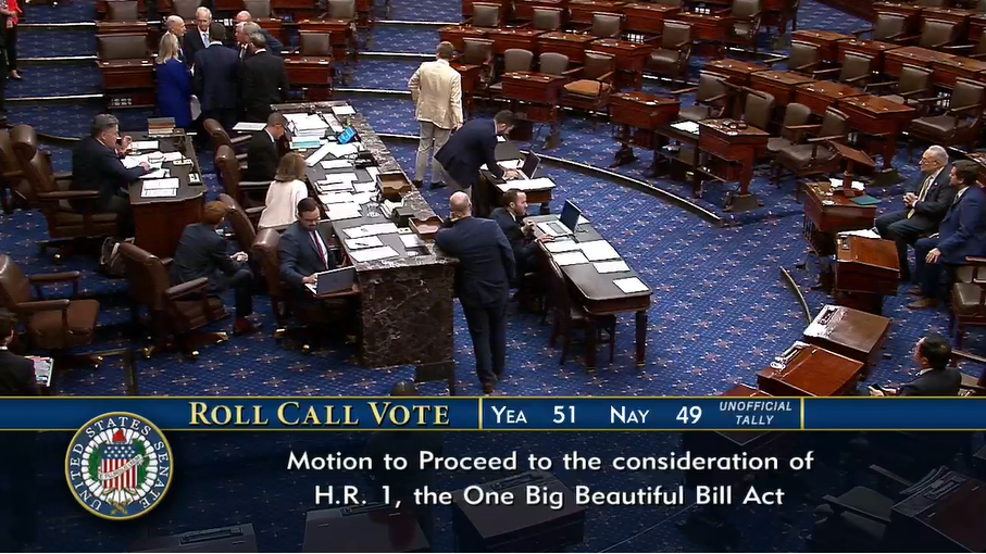 当地时间6月28日,美国参议院以51对49的票数比通过一项程序性动议,这项动议旨在推进被美国总统特朗普称为“大而美”的大规模税收与支出法案。美国参议院程序性投票通过后,未来几天法案通过的可能性增加。