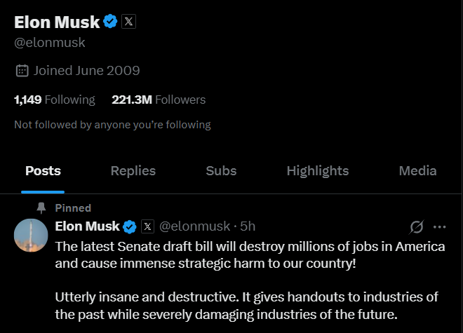 当地时间6月28日,美国企业家埃隆·马斯克在社交媒体平台上发文表示,美国参议院关于大规模税收与支出法案的最新草案“将摧毁美国数百万个就业岗位,并对美国造成巨大的战略伤害”。马斯克还说:“这项法案将债务上限提高5万亿美元,这是历史上最大的增幅,让美国走上被债务奴役的快车道。”