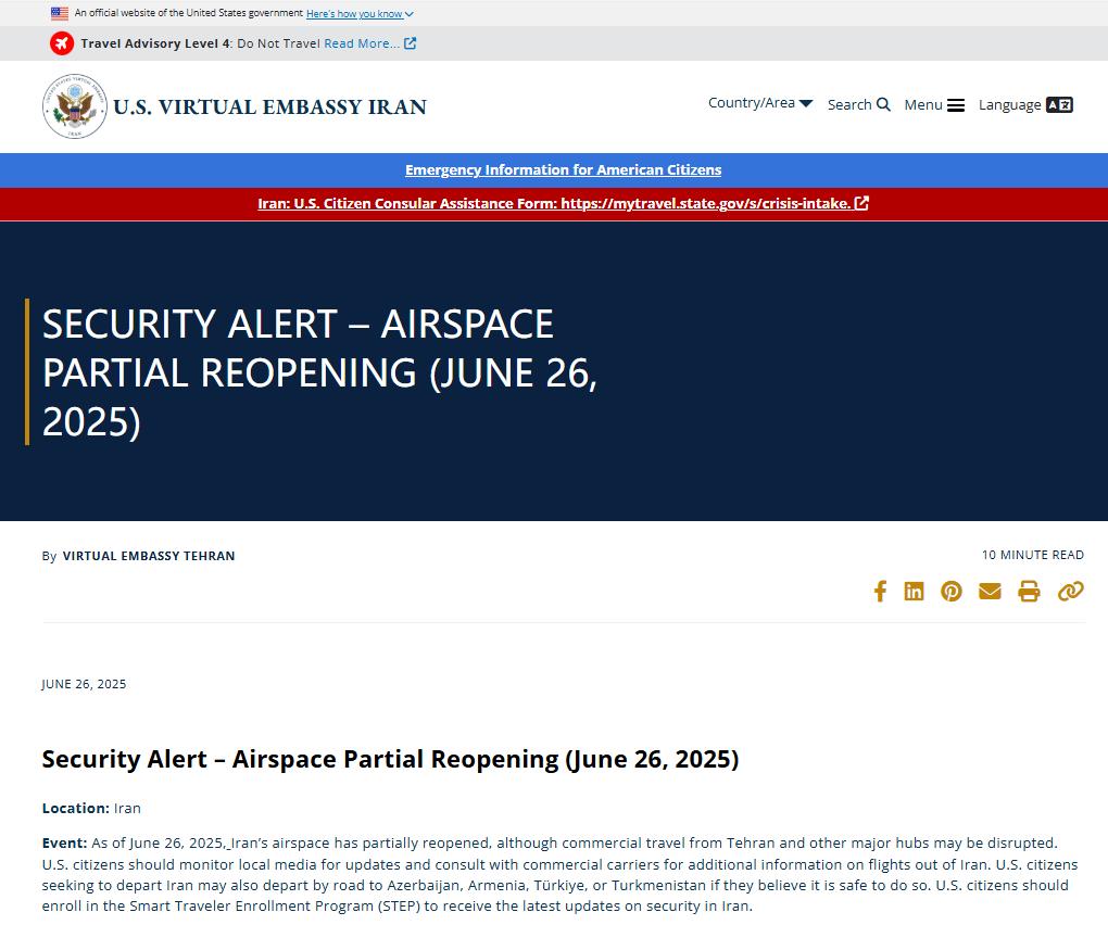 △美国虚拟驻伊朗大使馆于6月26日发布的公告截图