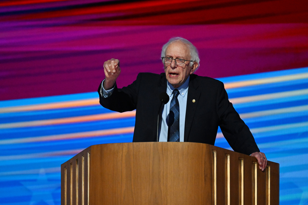 2024年8月20日,在美国芝加哥,美国佛蒙特州联邦参议员伯尼·桑德斯在民主党全国代表大会上发言。新华社记者李睿摄