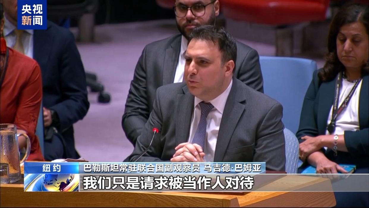 巴勒斯坦常驻联合国副观察员 马吉德·巴姆亚:我们只是请求被当作人对待,这不过分吧?暗示我们不配得到这样的对待,或是我们应该对所有遭遇逆来顺受并心存感激,这是种侮辱。既然谈到对人道救援人员的袭击,那我们就应该来谈谈,对人道工作人员、联合国工作人员的袭击,至于哈马斯……