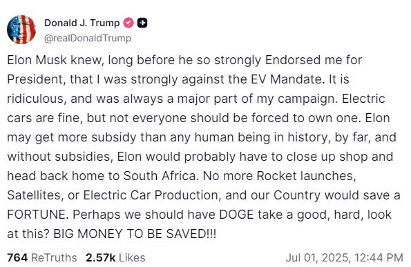 特朗普在帖文中称,“埃隆·马斯克在强力支持我竞选总统之前,早就知道我强烈反对‘电动汽车强制令’。这太荒谬了,这一直是我竞选活动的主要部分。电动汽车没问题,但不应该强迫每个人都拥有一辆。埃隆获得的补贴可能远远超过历史上任何一个人。如果没有补贴,埃隆可能不得不关门大吉,回到南非老家。不再有火箭发射、卫星或电动汽车生产,我们的国家将节省一大笔钱。也许我们应该让政府效率部好好查查?这能省下一大笔钱!”