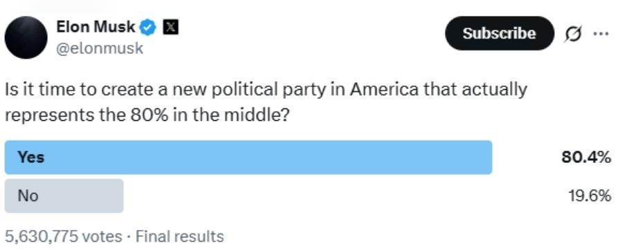 6月5日,马斯克首次提出这一想法。他在社交平台X上向2.2亿粉丝发起投票,询问是否同意“是时候在美国创建一个真正代表80%中间派的新政党了”。调查结果显示,超过80%的投票者都选择“是”。马斯克6日晚间发文称:“这是命运。”随后,马斯克还表示赞同一位粉丝提出的党名建议——“美国党”(America Party)。(详情>>)