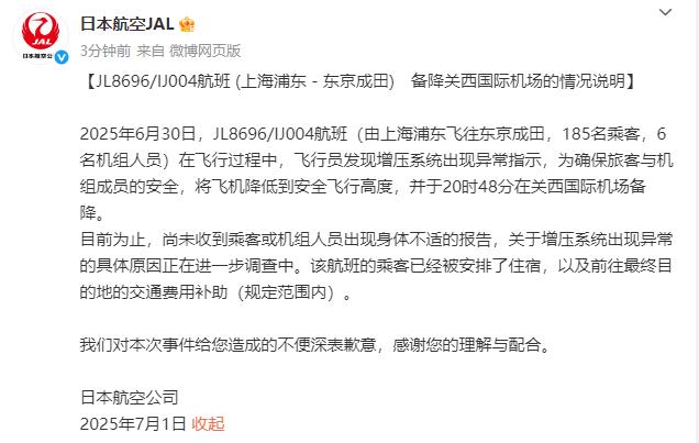 2025年6月30日,JL8696/IJ004航班(由上海浦东飞往东京成田,185名乘客,6名机组人员)在飞行过程中,飞行员发现增压系统出现异常指示,为确保旅客与机组成员的安全,将飞机降低到安全飞行高度,并于20时48分在关西国际机场备降。