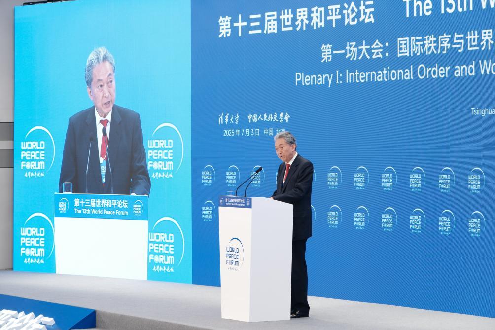 7月3日,日本前首相鸠山由纪夫在北京清华大学参加第十三届世界和平论坛。新华社记者邓仙来摄