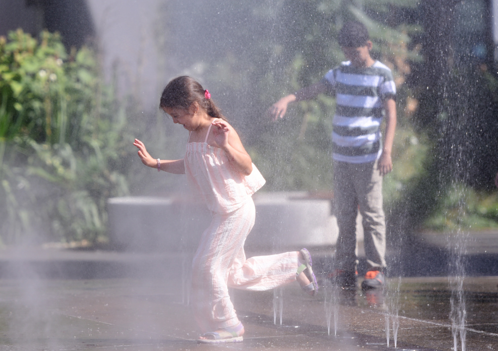 7月3日,在奥地利维也纳,孩子们在一处喷泉装置旁玩耍。(新华社记者贺灿铃摄)