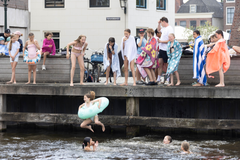7月2日,在荷兰哈勒姆,孩子们跳水纳凉。新华社发(西尔维娅·莱德雷尔摄)