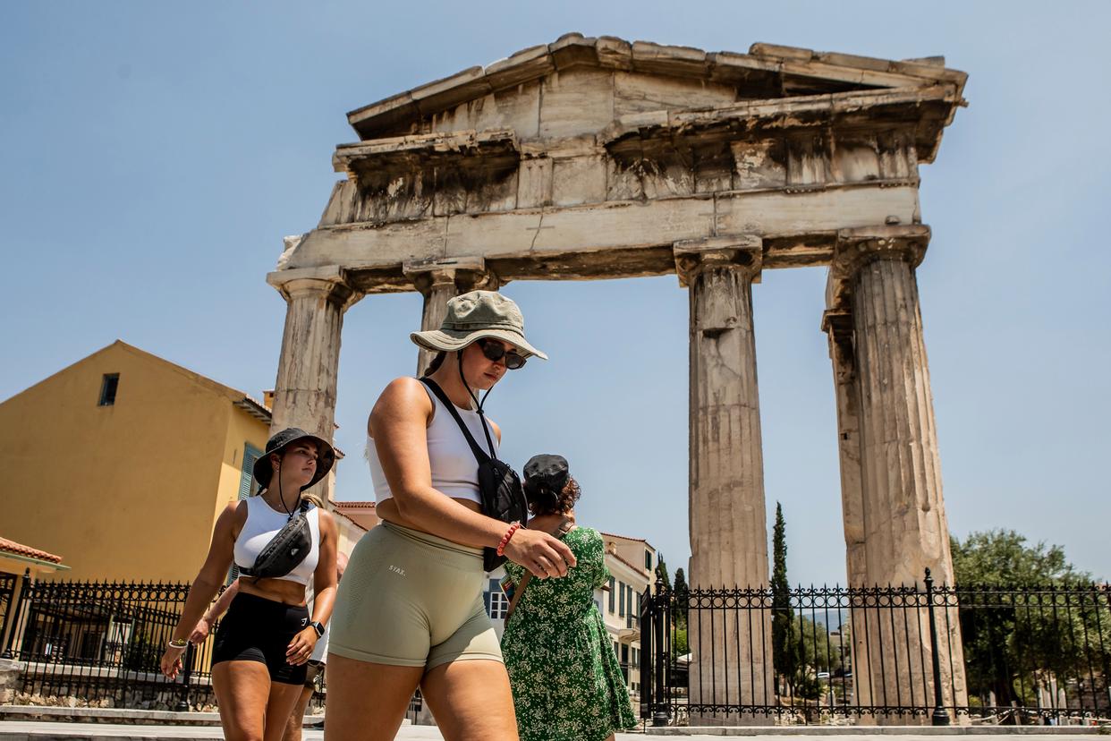 2023年7月12日,游客顶着烈日游览希腊雅典。新华社发(帕纳约蒂斯·莫斯卡德里欧摄) 作为希腊最大岛屿,旅游业是克里特岛主要收入来源。由于此次火灾正值夏季度假旺季伊始,当地酒店经营者担忧客流量减少。