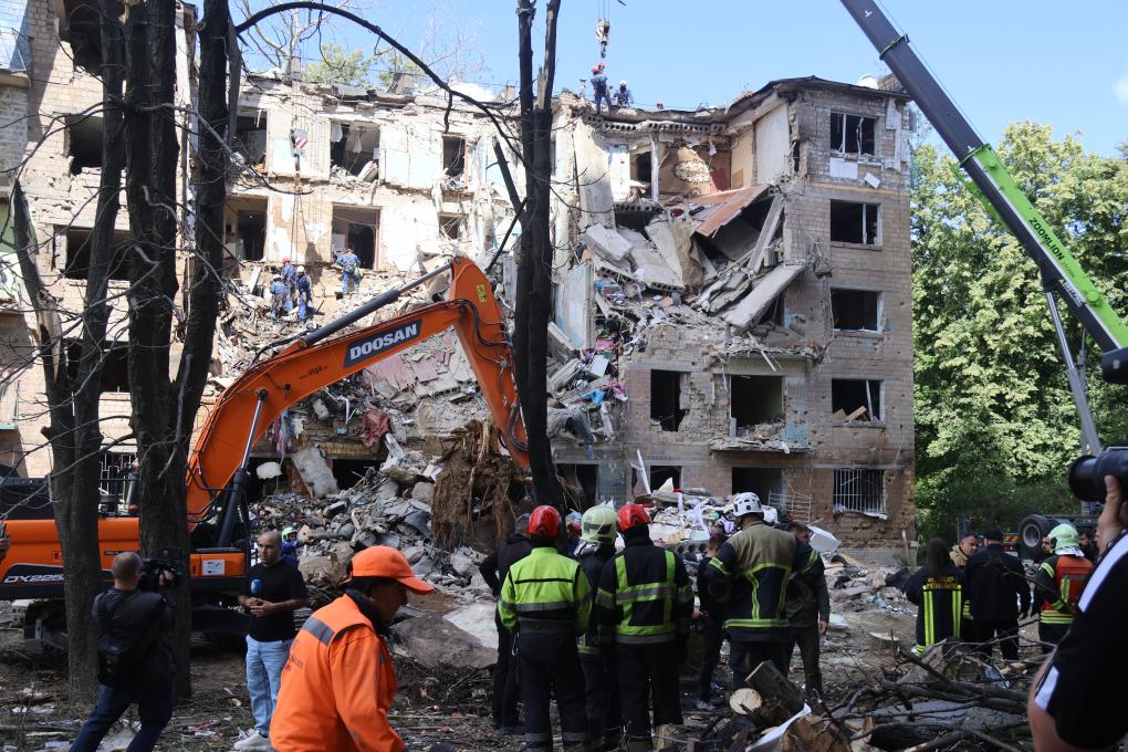 6月23日,乌克兰国家紧急情况局工作人员在基辅市的舍甫琴科夫斯基区遭空袭现场进行搜寻和清理工作。新华社发(彼得·德鲁克摄)