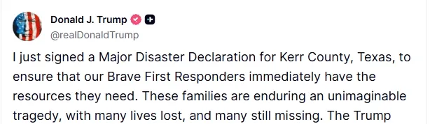 当地时间6日,美国总统特朗普宣布,他已签署得克萨斯州克尔县的“重大灾难声明”,此举旨在确保急救人员能立即获得所需资源。特朗普表示,“得州发生了可怕的事情”,他已与得州州长取得了联系。