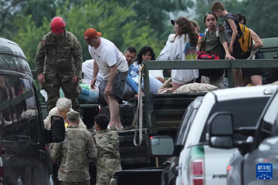 4日,在美国得克萨斯州英格勒姆市,应急人员转移受洪水影响的民众。