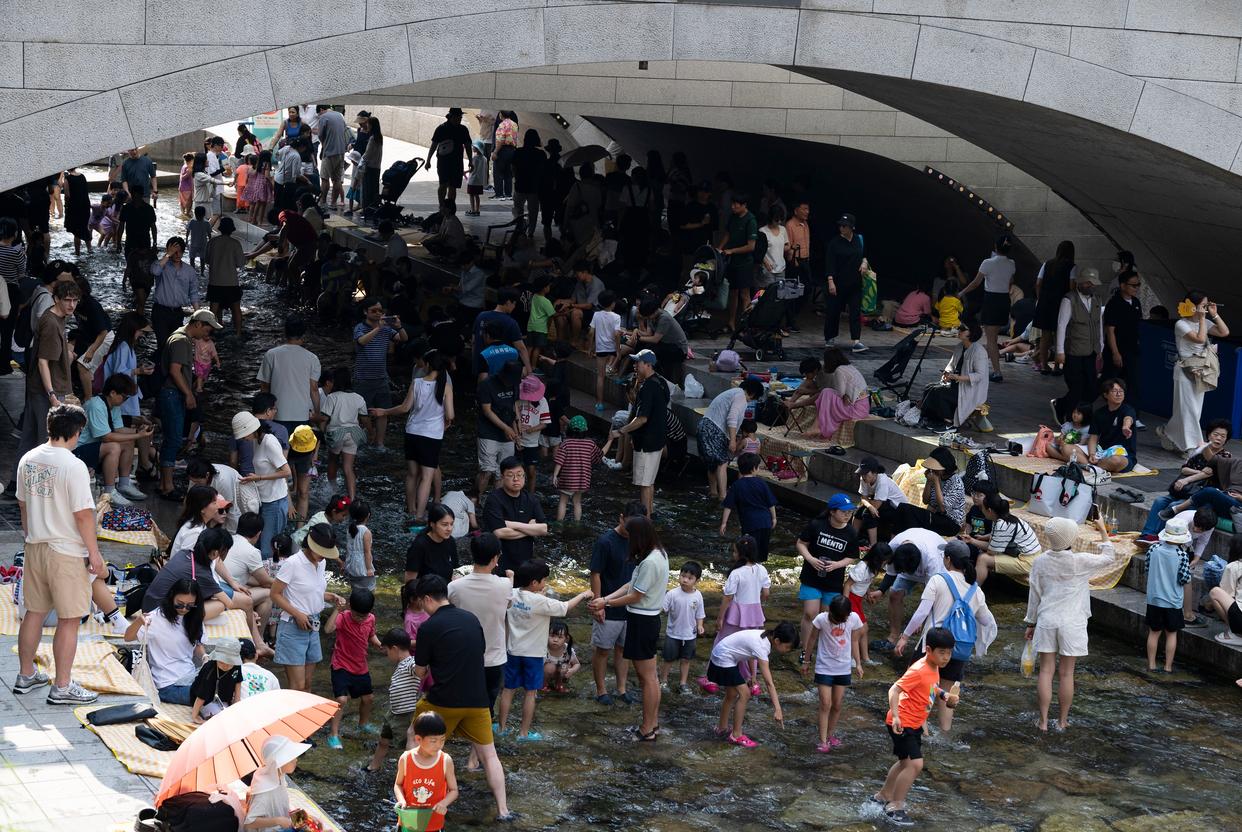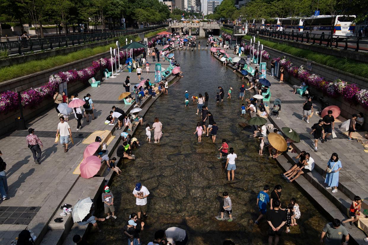 6月14日,人们在韩国首尔的清溪川戏水。新华社发(全休相摄) 据韩联社报道,疾病管理厅今年5月15日启动高温相关病症监测预警系统,截至本月6日,全国累计报告875名患者,7人不治身亡。若按照去年5月20日的监测起点统计,今年同期患者为859人,同比增长83.2%,死亡人数增加一倍多。