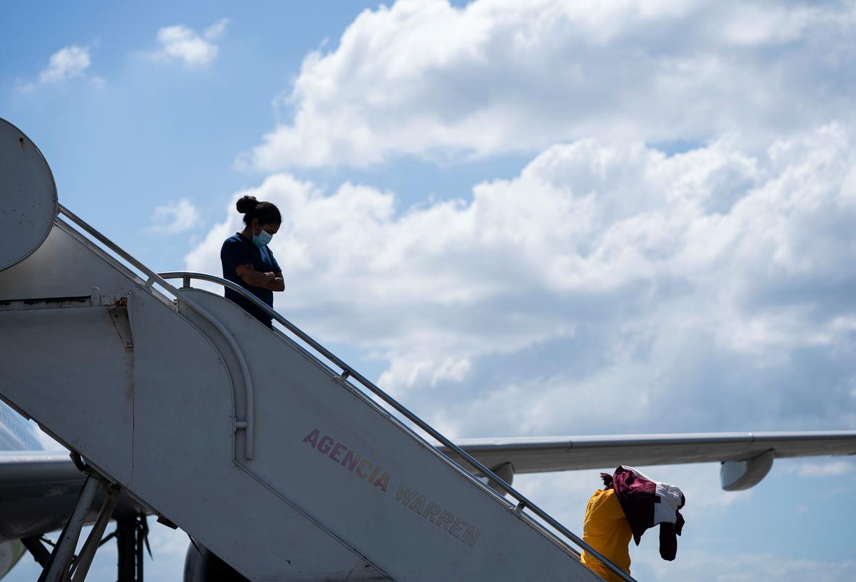 2月14日,在洪都拉斯西北部城市圣佩德罗苏拉的拉蒙·比列达·莫拉莱斯机场,返乡移民走下飞机。新华社发(戴维摄)