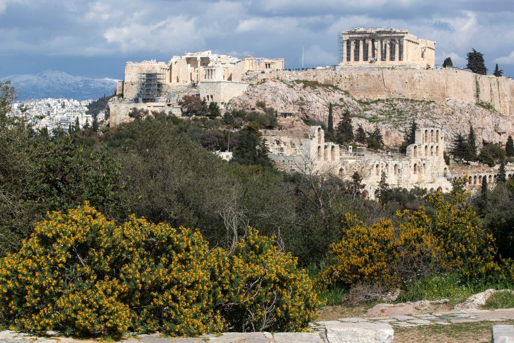 2022年3月14日,希腊雅典卫城对面山坡上野花盛开。新华社发(马里奥斯·罗洛斯摄)