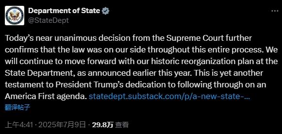 美国国务院当天在社交媒体上发文说:“我们将继续推进国务院的历史性重组工作。”